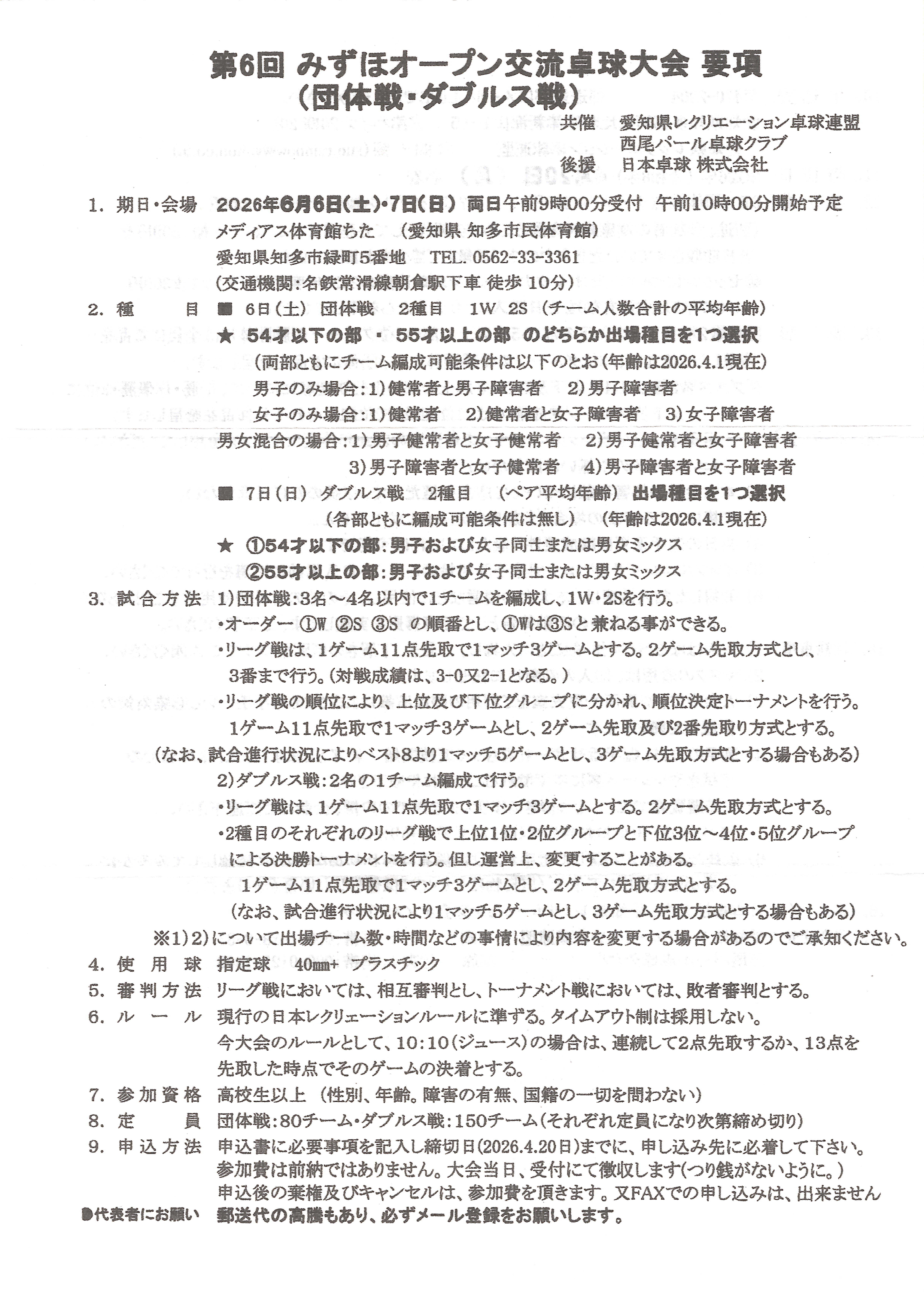 第6回 みずほオープン交流卓球大会の案内が届いています。