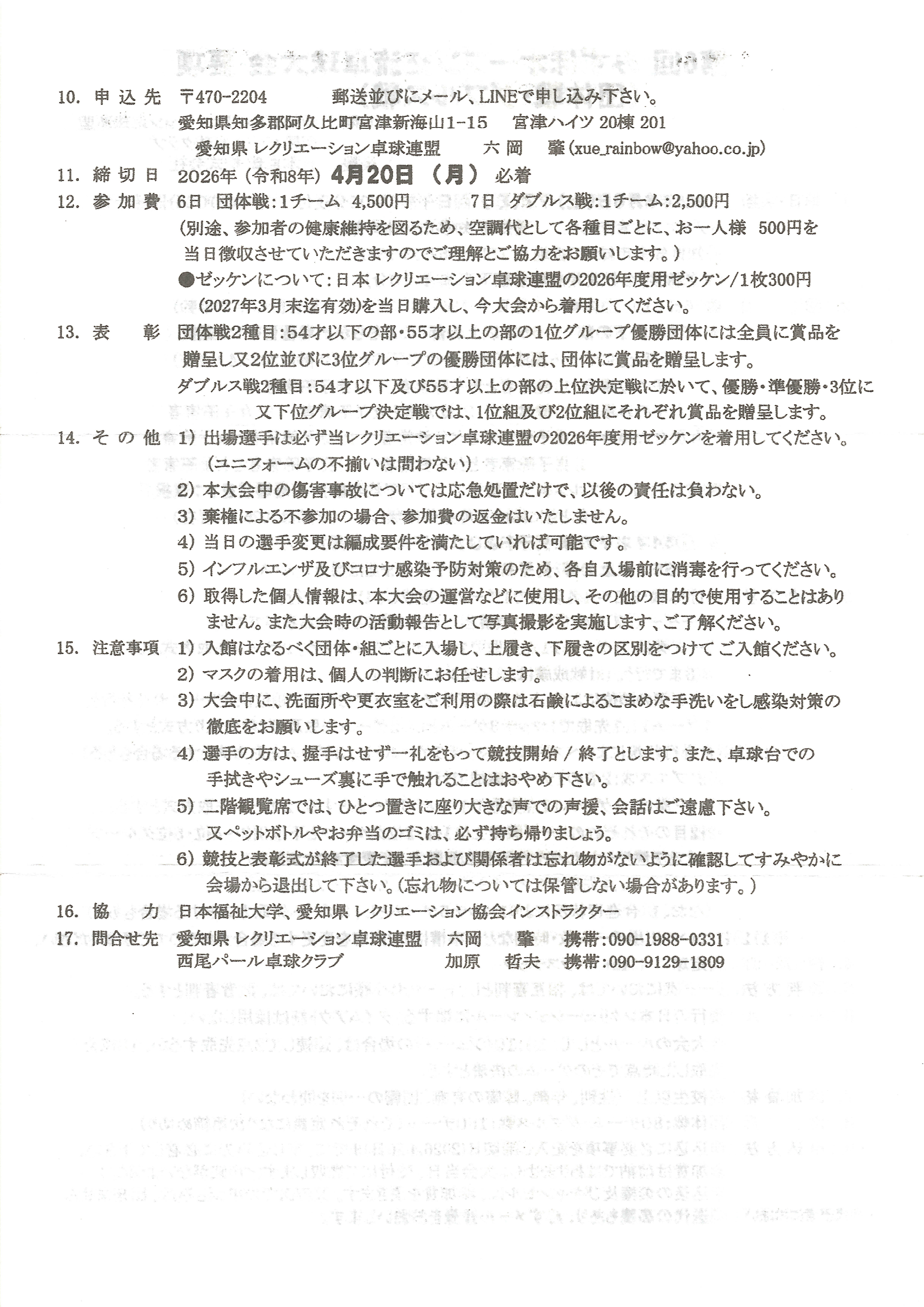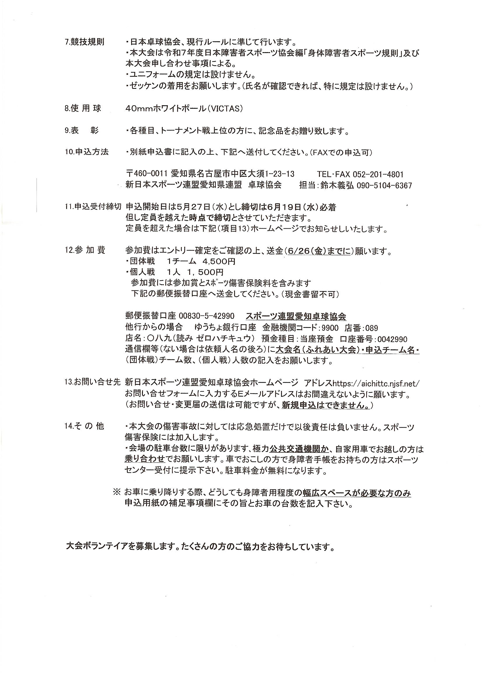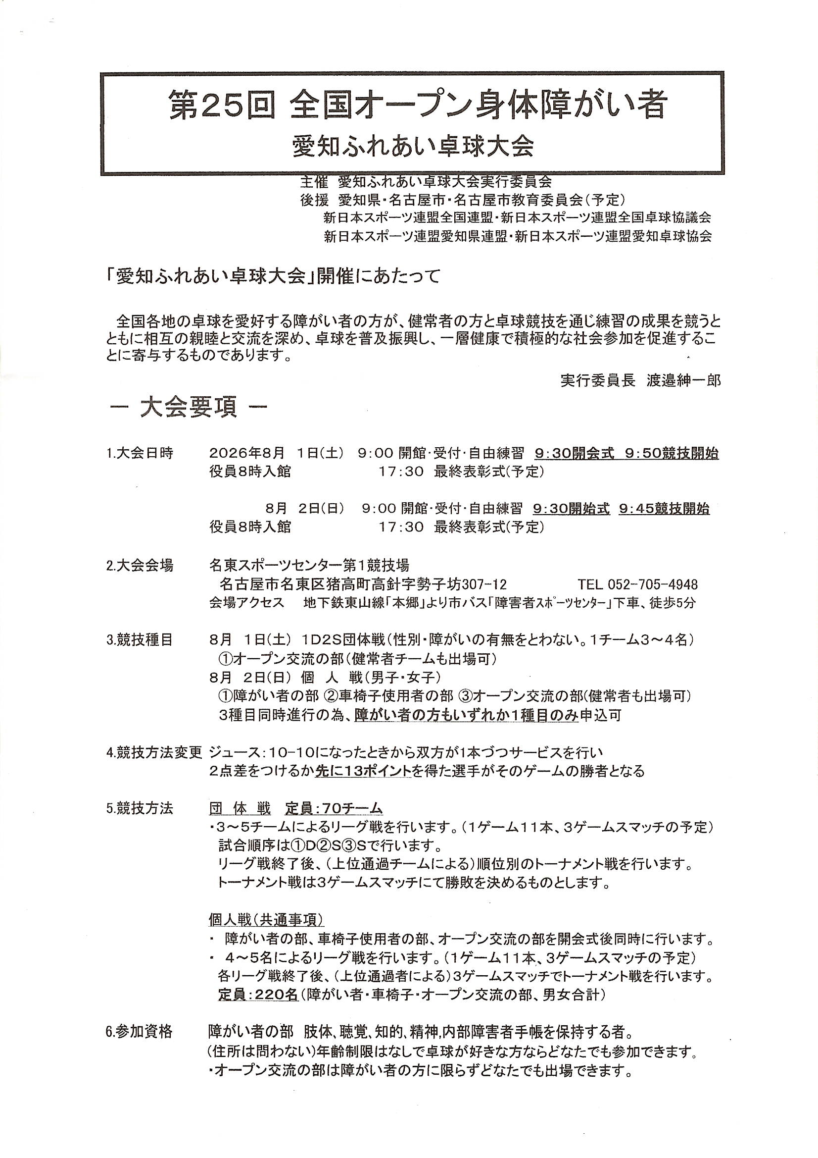 第25回 全国オープン身体障がい者 愛知ふれあい卓球大会の案内が届いています。